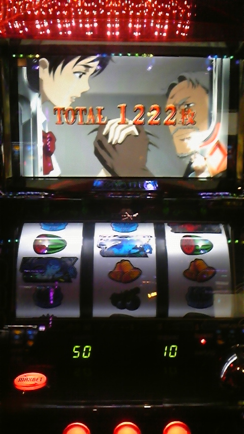 入場後イソイソと新台方面へ、BLOOD+が何故か全台空いていたのでとりあえず確保しました、実は初打ちなのでよくわからないままスタートして250回転ほどで赤BIG後ART突入一撃で1500枚確保しました、その後店の波に乗り1150回転ハマり1500枚が100枚ほどまで減りました;;
